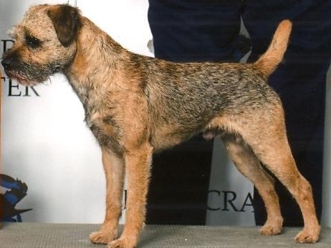 Super upstanding blue bitch, narrow throughout and not overdone. Good head, flat skull with correct bite and small neat ears. Varminty expression. Straight narrow front with best of shoulders flowing into well ribbed back and level topline held well on the move. Thick carrot tail well set on. Tight harsh double coat. Moved really well with good drive and enthusiasm. Could see her easily doing a day’s work. Best Bitch and Best In Show.
