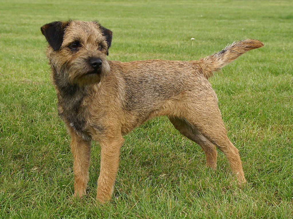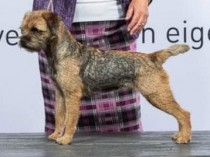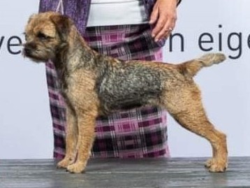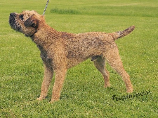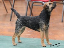 Well made grizzle and tan bitch with plenty of substance. An attractive Otter like head with strong under jaw, dark kind eye and expression & well placed ears. Pelt was thick. Good front and correct rib and loin, well bodied and Nice for size, easy to span. Good tail set, shape and length Strong well set quarters, which she uses to her advantage and she moves soundly Coming and going, covering the ground with reach and drive. Sound puppy who could do a good days work. BP.