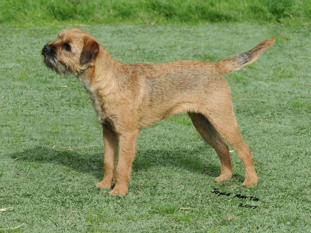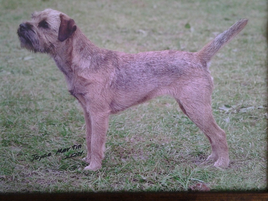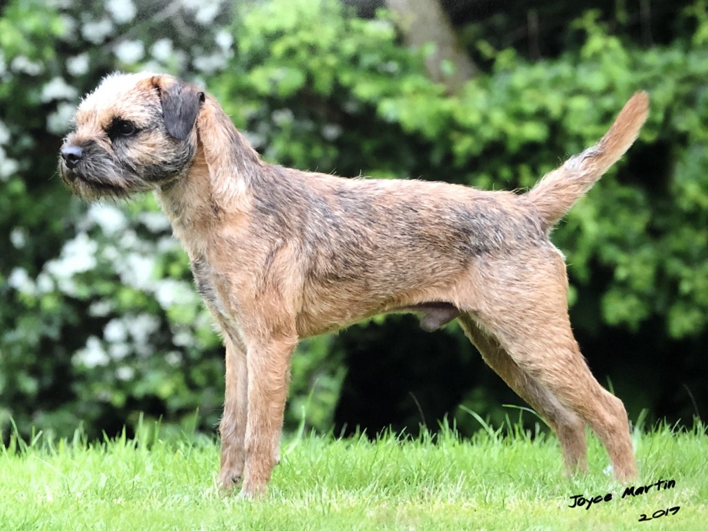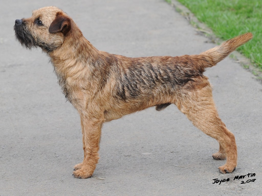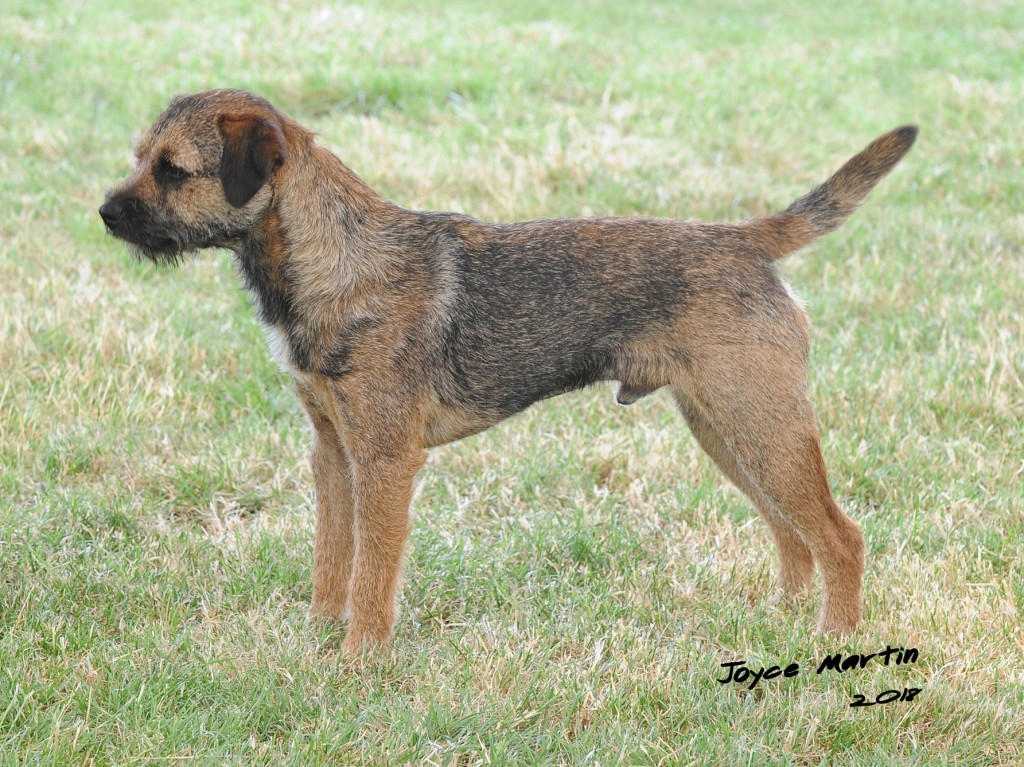 8 years old and extremely fit, this dog is narrow throughout and so nice for size. Masculine head and dark eye, has a strong jaw and a real varminty expression. Built on good bodylines he had a thick harsh double jacket, the most pliable of pelts, good rib and strong loin. Easily spanned, he is well angulated and moved with drive.