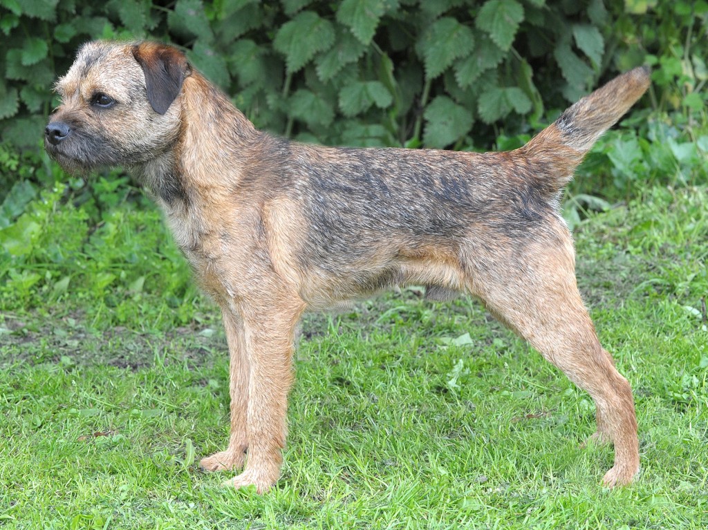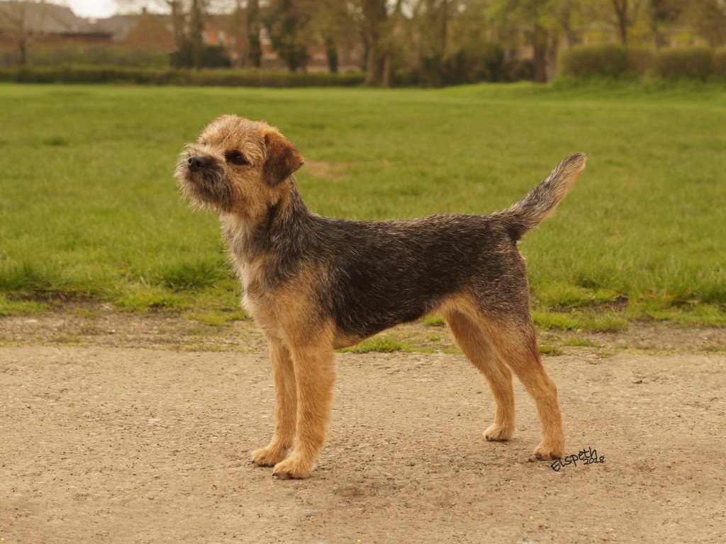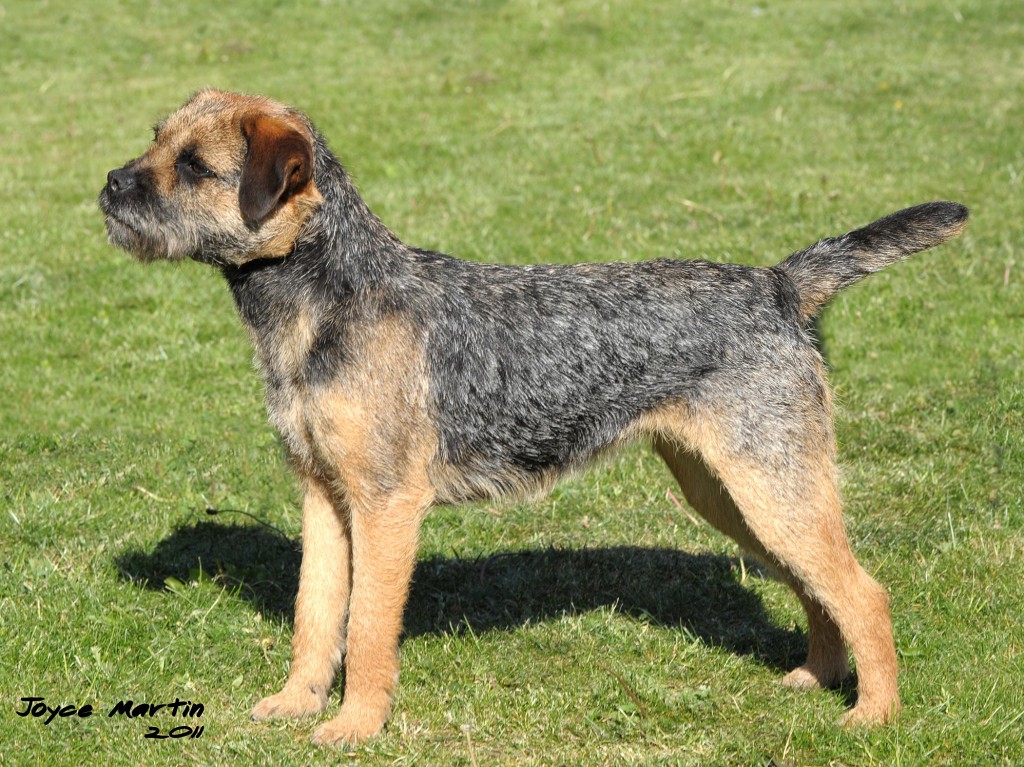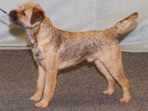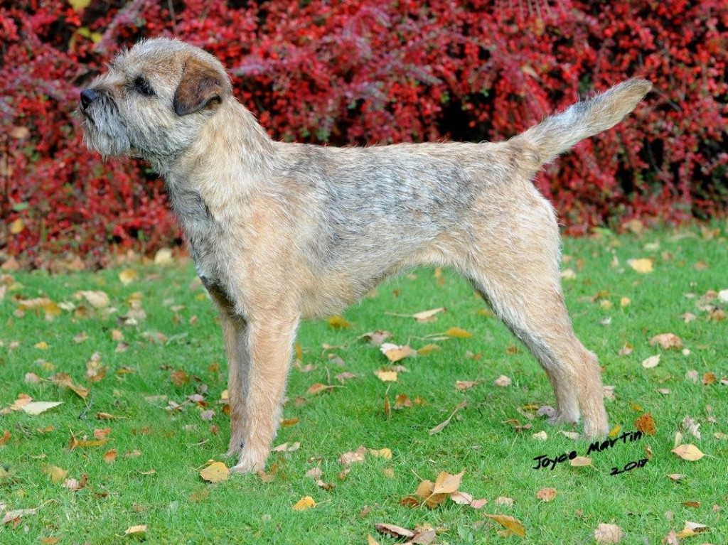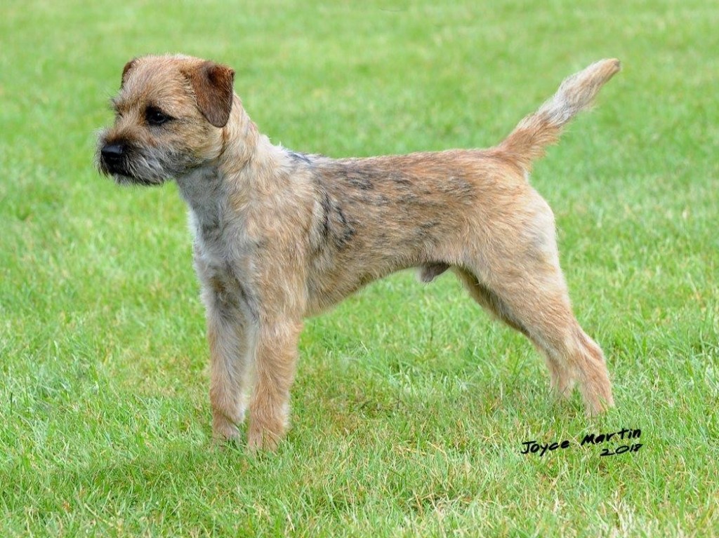 8 years old and extremely fit, this dog is narrow throughout and so nice for size. Masculine head and dark eye, has a strong jaw and a real varminty expression. Built on good bodylines he had a thick harsh double jacket, the most pliable of pelts, good rib and strong loin. Easily spanned, he is well angulated and moved with drive.