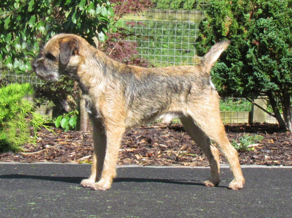 a taller dog, has a masculine head with nice dark points, good jaw and strong teeth, narrow front, well ribbed back he had the harshest of jackets, racy hindquarters and stands on good feet. He moved with purpose and looked good in profile.