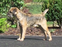 Just out of puppy he is nice for size. Well proportioned, he has a good head with keen expression, narrow front, good shoulder and well ribbed back. Easy to span he has nice free movement, a good topline and tailset. Just right for bone he has tight firmly padded feet.