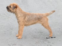 BD,BIS & BVIS 8 year old red grizzle in super harsh coat,with an exceptionally strong otter like head and good bite. Good lay back of shoulder,super overall outline,moved out well for and after. Turned out well and handled well. Pleased to award him top honours today.