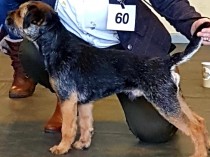 Promising 6 month old blue and tan bitch shown beautifully on a loose lead. Not overdone for age in anyway. Sweet feminine head with a good reach of neck and straight topline leading to a well set on tail. Moved well for one so young with lovely front and rear angulation.