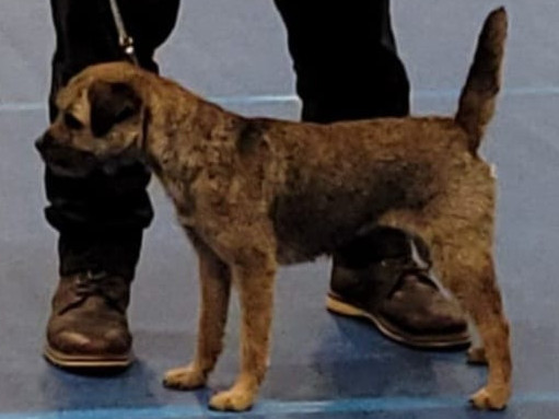 14 month grizzle,easy winner in this class,pleasing head ,flat skull,strong muzzle & underjaw,correct bite,clean neck & shoulders,striaght front,neat well padded feet,strong through the loin,tail set well on, well angulated rear construction,with good muscle tone,in harsh coat & thick pelt,moved well.