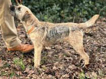 2 years and 10 months old blue and tan bitch of a handy size with a nice feminine head and nice small ears, nice flow of neck into shoulders with correct rib and spans really easily. Set down in great condition, good jacket and a thick pelt.