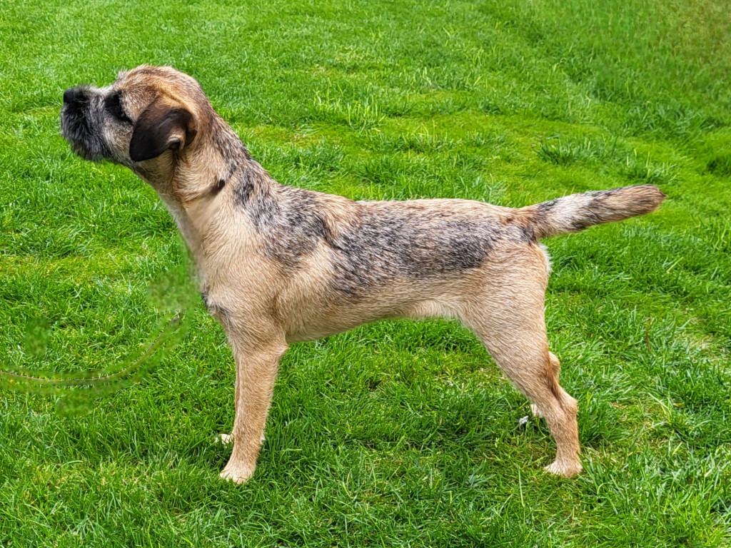 Another eye-catching and quality dog. Excellent otter head, correctly proportioned with a broad muzzle, plenty of strength under the eye which ensures a typical border expression. Nice for length of neck, shoulder and rib. He is well muscled with firm top line and strong and well angulated rear. Shown in harsh double coat harsh, with a thick, loose and pliable pelt, he is easily spanned. Moved confidently with reach and drive around the ring.