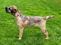 A nice typey border terrier that has an attractive otter head of the correct proportions, keen expression, short muzzle with good dentition and plenty of strength under the eye. Nice in profile and narrow throughout and easily spanned. Shown in a harsh, tight double jacket with a thick and flexible pelt. Decent rear angulation meant that he could move around the ring with ease.