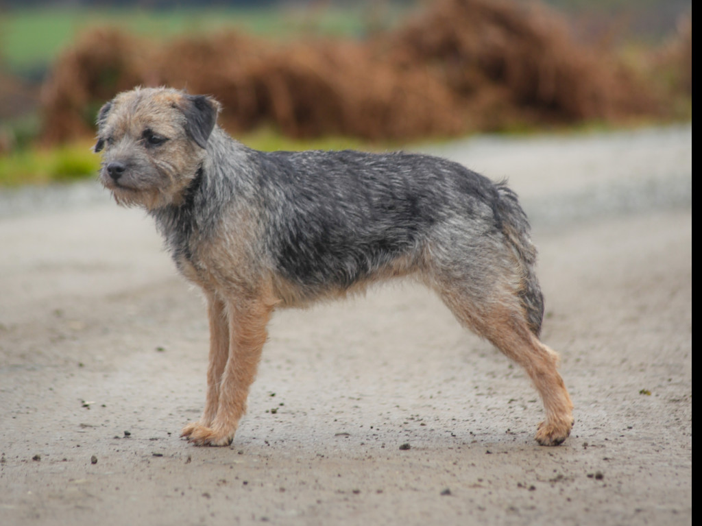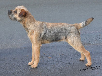 Grizzle bitch with a good head, dark keen eyes, short muzzle and good dentition. Narrow straight front and well boned standing on neat padded feet.Good length of body and level topline.Good angulation front and rear moving easily round the ring.