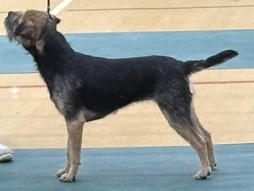 Red grizzle of sound construction, with masculine head and dark eye with good ear carriage. Narrow front with a good lay of shoulder,nice padded feet,level topline and carrot tail. Well muscled with a good harsh jacket and thick loose pelt. Moved easily round ring.
