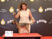 A bitch from the very top of the tree who fits the standard so well with everything in moderation and nothing in excess. So good to handle, has a classic otter head in correct proportions, good bite of large teeth, strong muzzle of good depth little stop and nicely shaped skull with well placed ears to give a keen varminty expression. Ideal neck length, straight narrow front with legs well off for bone she stands on tight well padded feet. Her front construction is excellent with good return of upper arm and a well angulated rear to match. Her ribs are carried well back and span easily. In the thickest of harsh double coats with handfuls of pelt she moves with ease to reach out in front and drive from behind using her fit condition. Whenever you look at her she appears balanced whether standing or on the move. Could not be denied the BCC today and unlucky to meet the dog in top form.