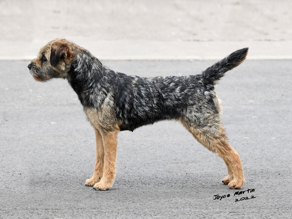 Dark grizzle and tan. Possesses a good masculine head, moderately broad skull, keen expression, well set on ears and good bite. Excellent neck and shoulders, and good return of upper arm. Lovely bone and feet. Excellent rib and easily spanned. Strong loin and good topline and tailset. Shown in a good topcoat, with a decent undercoat and pelt. This still very excitable youngster continues to give his handler a very tough time, doing all he could to present himself in the worst possible manner especially when moving around the ring. However despite this, on the odd occasion when he did co-operate, glimpses of his qualities could be appreciated.