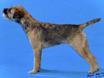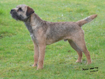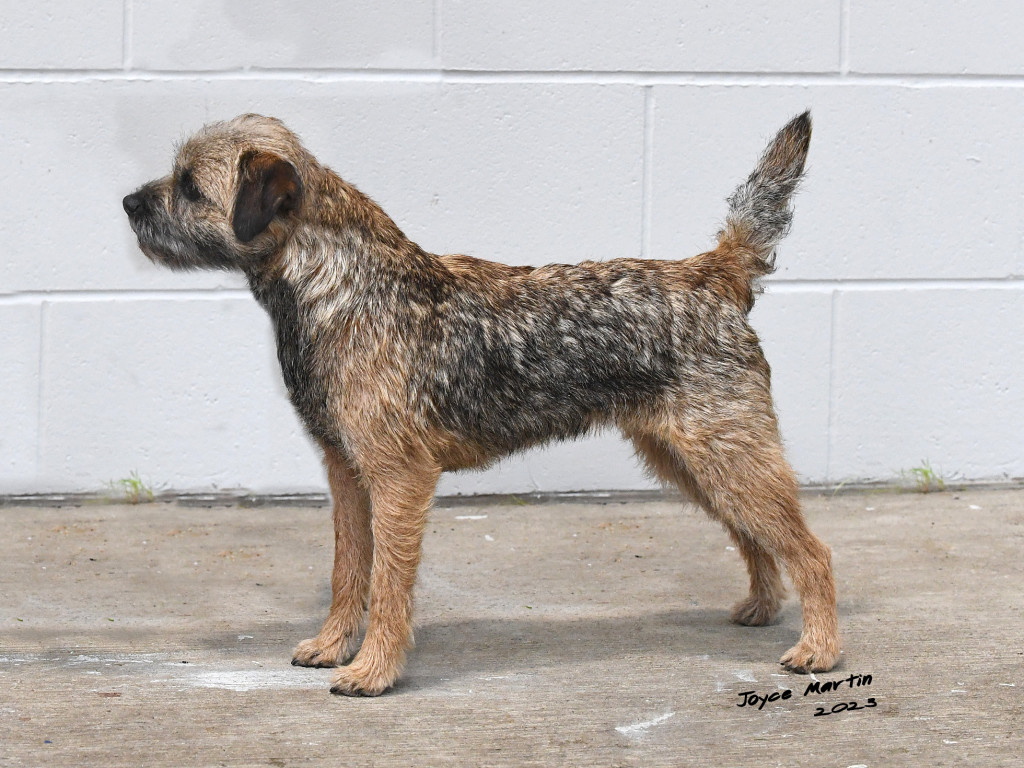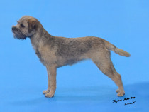 Another grizzle & tan with some promise. 19 month old confident smaller sized bitch but with all the essentials in the right place. Pleasing feminine head with a dark eye and keen expression, correct bite. Well placed ears. Good reach of neck, narrow front standing on small tight feet. Possesses a level topline with a short carrot tail. Well angulated hindquarters. Good double coat and thick pelt completed the picture. Showing herself well on the move covering the ground with ease.