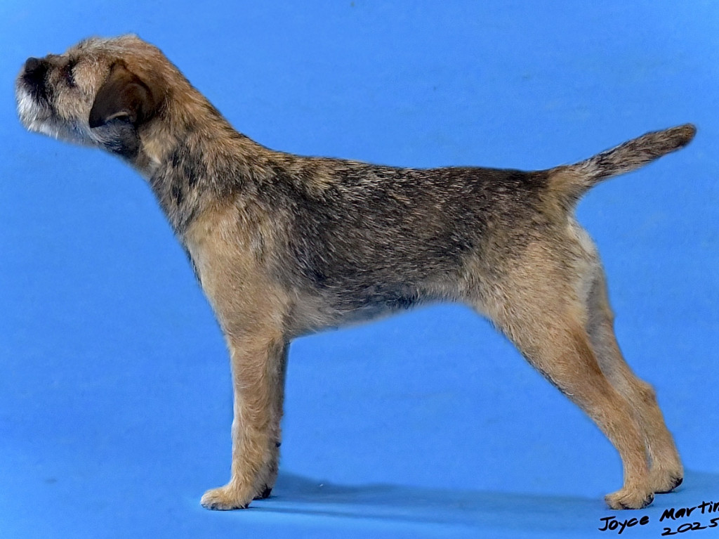 10 months old grizzle & tan quality puppy excelling in breed type. Delightful feminine head with shallow stop, correct scissor bite and neat ears. Good reach of neck flowing into well angulated shoulders with good length of rib, carried well back. She has a straight narrow front with strong tight feet, excellent topline with a short carrot tail. Came easy to hand. Well angulated both front and back, Good harsh wire coat with a loose thick pelt. Moved impressively around the ring in her class but in the challenge for Best Puppy seemed to have decided that she had had enough for one day. Will watch her progress with interest.