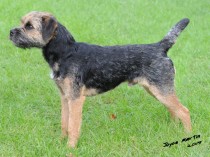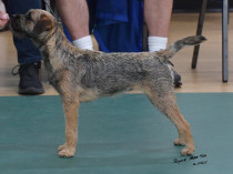 Extrovert 14 month old blue & tan full of breed type that took my eye straight away when I moved the class around the ring. Balanced feminine head but with adequate strength of muzzle, dark eye giving a miscevious expression and small well placed v shaped ears completing the picture. Good reach of neck flowed into a lovely layback of shoulder, narrow body, ribbed well back and strong in loin. Was very easy to span. Spirit level topline and well set very short tail. Well angulated powerful hindquarters. Presented in a lovely dense jacket and thick loose pelt. When asked to move powered off enthusiastically around the ring covering the ground with a lovely fluid action both economically and soundly. Would certainly follow a horse and get to ground. Delighted to award her the Bitch C.C. in strong competition.