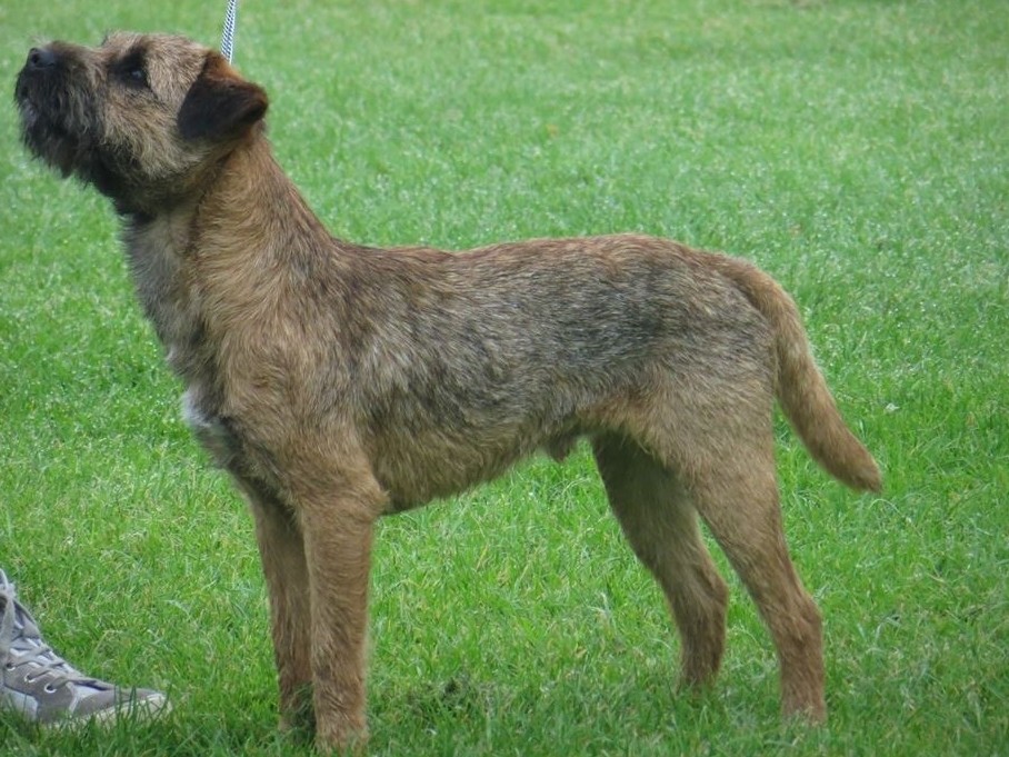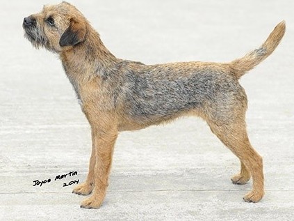 Lovely headed red grizzle, big teeth, excellent front, tight feet, narrow with a good jacket and harsh coat, good topline and tailset, covered the ground with ease, very promising pup will watch him with interest BPIB