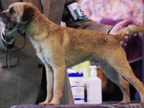A worthy red grizzle champion I have watched for some time. She spans and handles well, everything as it should be. Cracking head all in proportion .Strong muzzle and dark eyes set wide apart, all framed by dark well placed ears. Lovely straight front, excellent construction front and rear. Good carrot tail and has a double coat and loose pelt. Well let down hocks used to move easily and cleanly both ways.