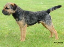 nice type of Border, in good condition, pleasing head, strong jaw, dark eye, keen expression, nice for size, good harsh double coat, moved well, easily spanned