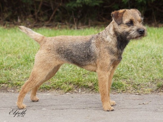 16 mths. red grizzle bitch, presented in excellent jacket, well balanced all through in conformation, I just liked the whole picture, for me a very pleasing Border Terrier, moved well looking as though she could keep going all day without tiring. RCC.