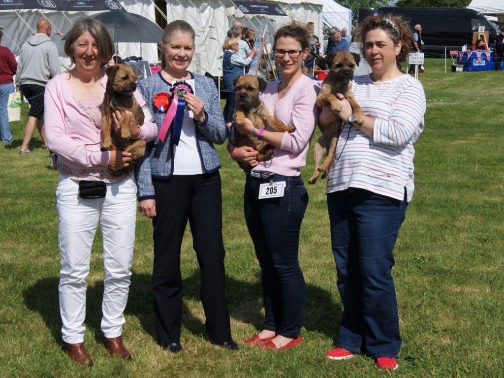 Well presented, feminine 11 month grizzle bitch puppy, good coat and pelt, straight front, level topline, good tailset. Moderately broad in skull nice in ear moved ok, well muscled, good for size, spannable