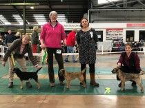 Grizzle and tan bitch just over a year old. Beautiful head with small ears and good bite. Moved well but can carry her tail a bit high when excited but this doesn’t detract from her outline and drive in rear action. Not quite the coat of 1 but more easily spanned that the open dog winner which gave her the edge for RBOB. Was also awarded RBOB in Group