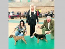 A stunning 7-month blue & tan dog puppy. Framing his strong tan otter-head, his blue coat with matching dark expressive eyes, black nose and correct ears. As well as distinguishing a good topline and tailset from a side view, his coat proved harsh with close undercoat, on the table. With nicely spaced forequarters and hindquarters, he moved well, stealing the limelight to win Best Puppy in Breed. Pleased he went on to win Group 2 in the Puppy Group.